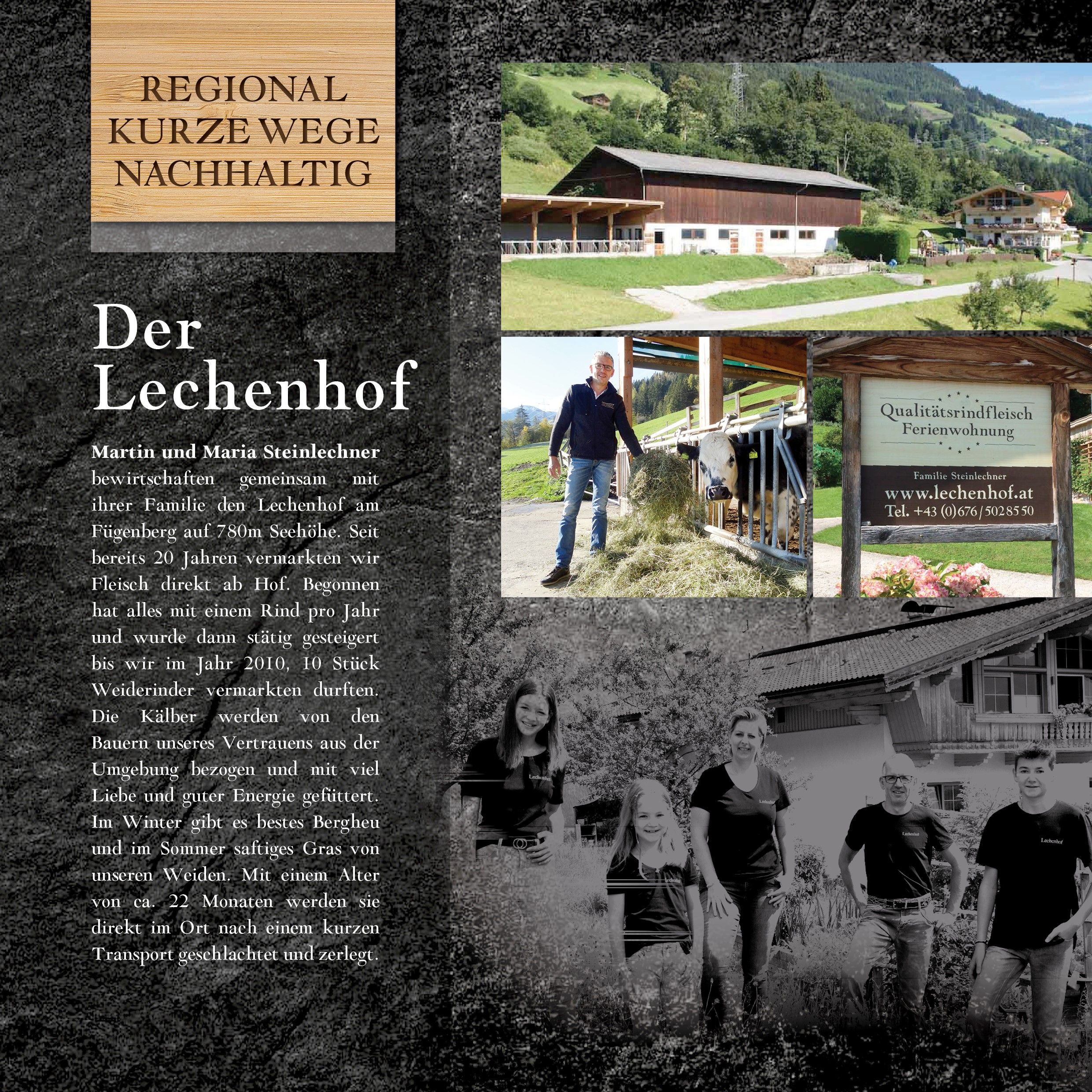 Wir bewirtschaften den Lechenhof in Fügenberg auf 780 m Seehöhe gemeinsam als Familie. Seit über 20 Jahren vermarkten wir hochwertiges Rindfleisch direkt ab Hof. Unsere Tiere beziehen wir regional, halten sie artgerecht und füttern sie mit großer Sorgfalt. Die Verarbeitung erfolgt schonend vor Ort nach kurzer Transportzeit.