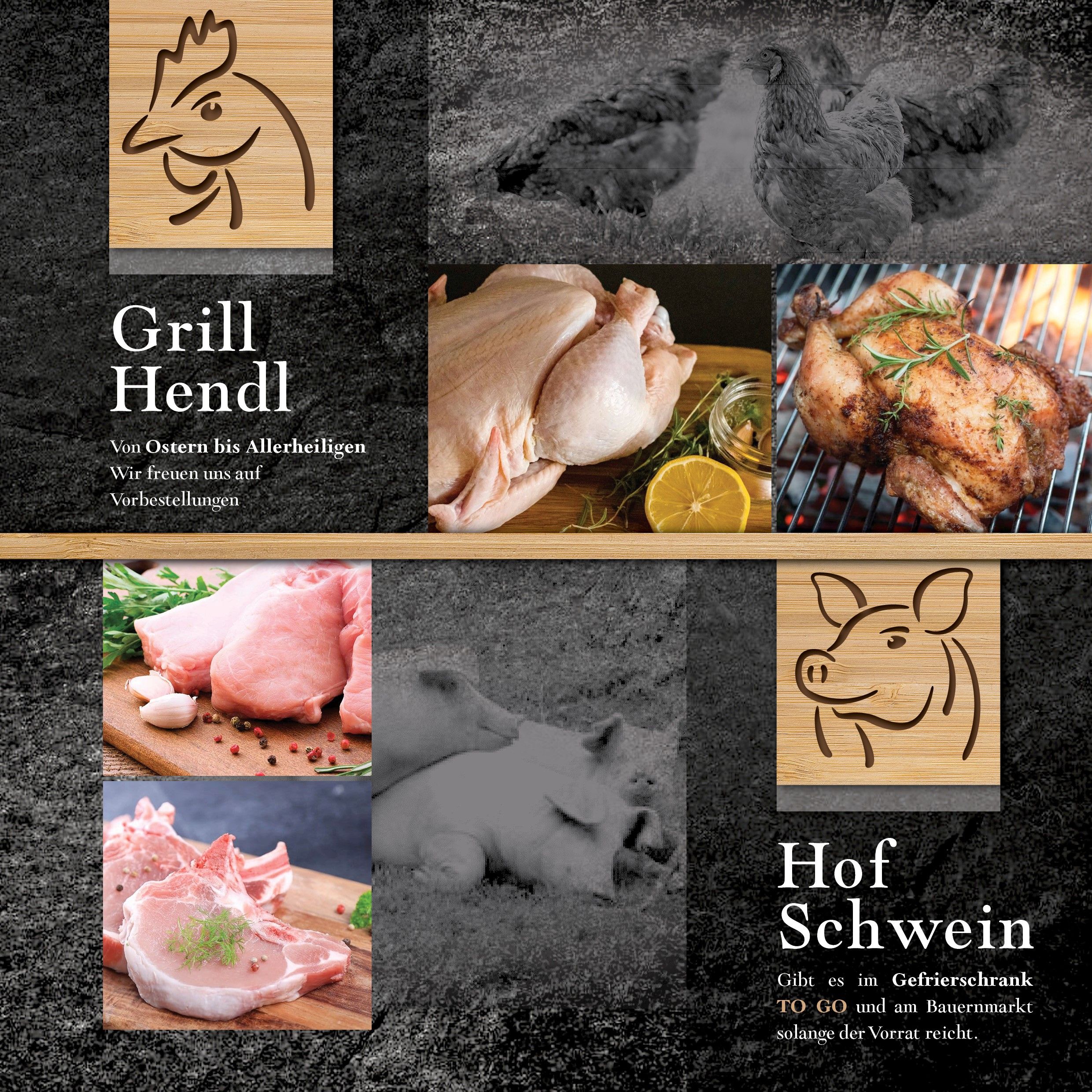 Es gibt Grill Hendl von Ostern bis Allerheiligen und Hof Schwein so lange der Vorrat reicht.