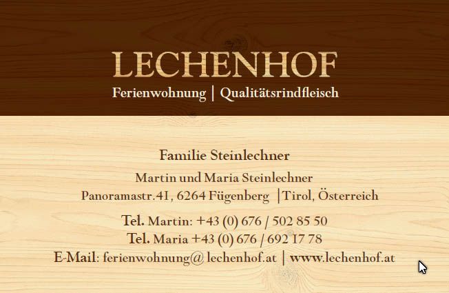Wir, Maria und Martin, bewirtschaften mit unseren Kindern Johannes, Magdalena, Anna-Maria und den “Alt - Bauersleuten” Hansi und Herta den Bergbauernhof “Lechenhof” am Fügenberg auf einer Seehöhe von 700 m. Im Jahre 2004 haben wir den Milchwirtschaftsbetrieb aufgegeben und uns auf die Direktvermarktung unserer Produkte spezialisiert. 2008 haben wir mit der Vermietung unserer Ferienwohnung begonnen. In den letzten Jahren wurde diese immer wieder renoviert. Im Oktober 2018 wird eine neue Küche eingebaut und unsere Gäste können ab Dezember 2018 ihre Kochträume in einer nagelneuen Tischlerküche verwirklichen.